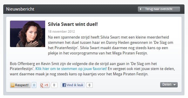 (Speciale dank voor de opnames van de videoclip : Galerie Atelier Femke Anne te Ruinen en Oefencentrum Noord B.v. Alsmede de stand-in Gerry, Chris, Henk en Albert Camera, Script en Storyboard : Roel Roelofs Regie : Henk Borg en Femke Kaldenberg) *** Silvia Swart is er bij op het MPF *** te Gelredome 15 December De uitslag is bekendgemaakt door www.sterren.nl welke 6 artiesten er een optreden mogen verzorgen op het Mega Piraten Festijn te Gelredome De andere 5 winnaars zijn : * Mike & Colin * Matthijs Koning * Erna Temming * Samantha Steenwijk & * Danny Temming Bedankt voor jouw stem !! ![]() * VOOR RADIO-STATIONS * Silvia heeft inmiddels 160 liedjes-tunes ingezongen voor Radio stations Mocht je ook een eigen herkenningslied of tune willen, mail dan even voor info naar : contact@silviaswart.nl